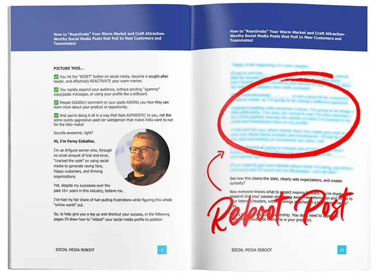 Don't worry though... if what you're currently doing isn't creating the results you desire, in the pages of my Social Reboot report you'll discover EXACTLY how you can hit the RESET button on your profile and start attracting highly interested prospects who EAGERLY comment on your posts ASKING you how they can learn more about your product or opportunity.